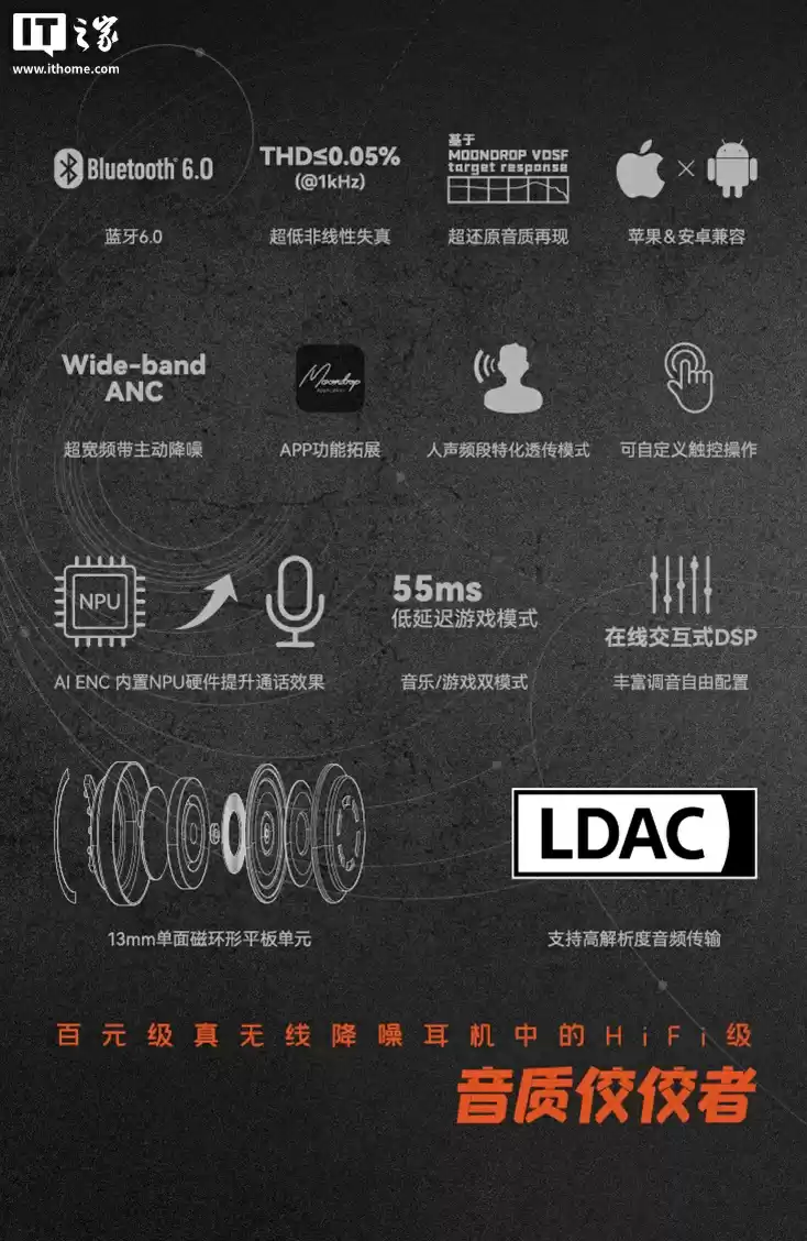 配置方面,新品搭载13mm大口径环形磁平板振膜单元,采用蓝牙6.0传输技术并支持LDAC高清音频编码协议。值得一提的是,耳机提供了仅55ms的超低延迟游戏模式,支持双设备无缝切换,用户还能通过专属App进行个性化音效调节。