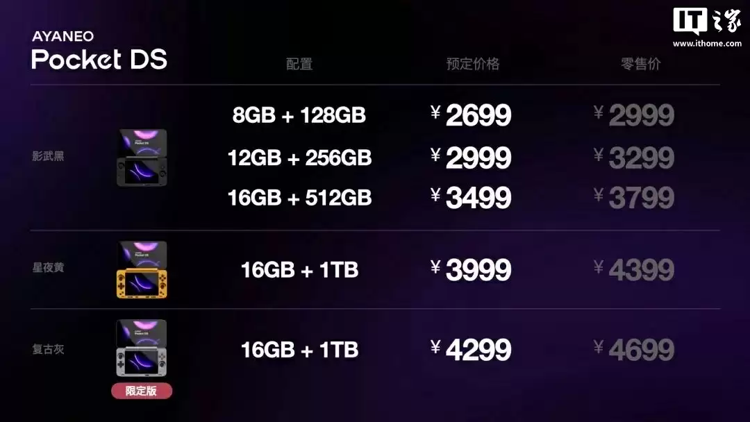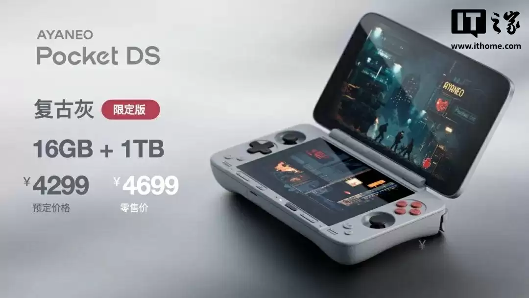 值得一提的是,AYANEO Pocket DS 掌机还拥有「复古灰」限定版本,预定价格 4299 元、零售价格 4699 元。