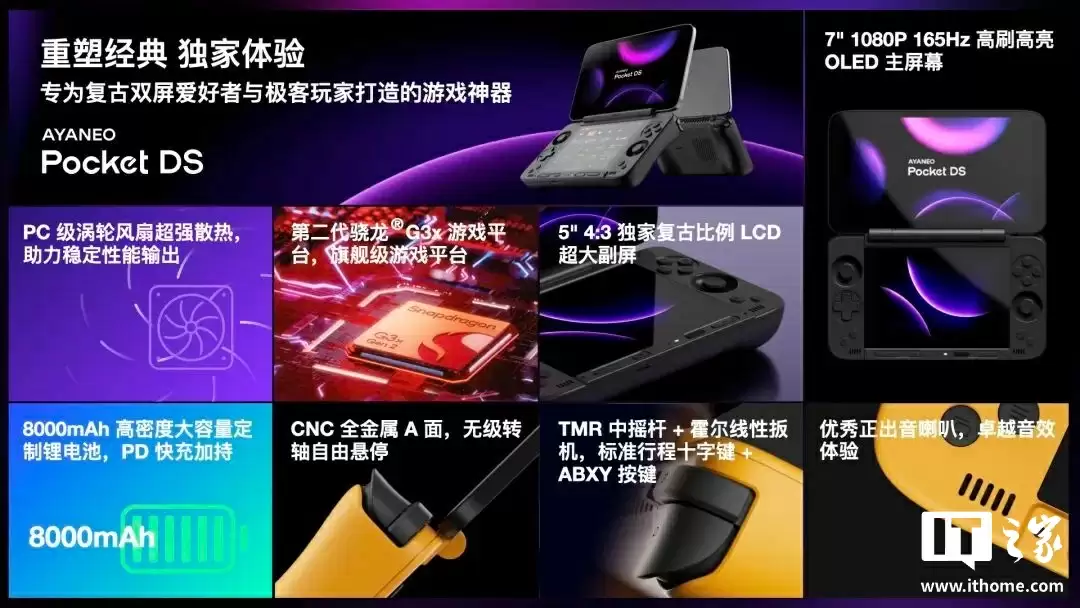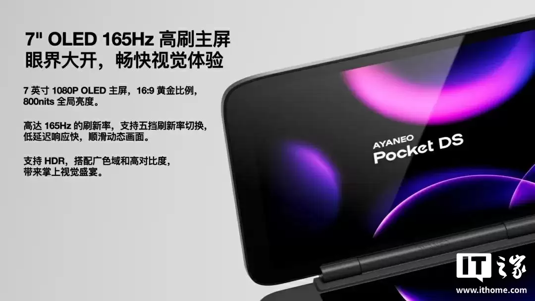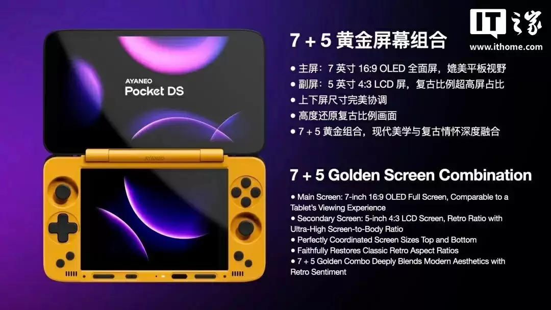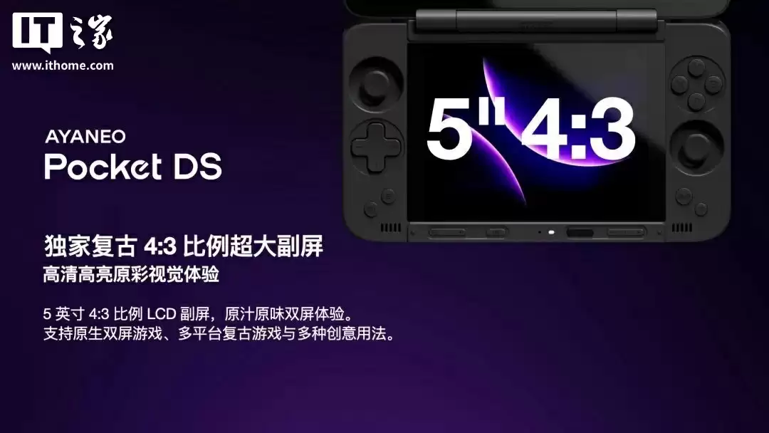 据介绍,AYANEO Pocket DS 掌机采用 7 英寸 1080P 165Hz OLED 主屏与 5 英寸 4:3 比例 LCD 副屏组合,主屏 16:9 全面视野媲美平板,副屏则还原复古比例,适配点对点 4X 高清渲染的 NDS 游戏、3DS 画面等。