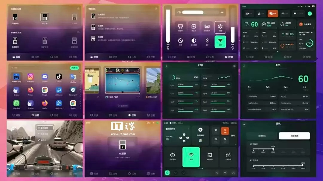 独立多任务功能支持卡片式任务菜单,随时便捷切换。副屏还可实时显示性能参数与状态,涵盖帧率、温度、负载等核心数据。玩家可在副屏直接切换性能模式、调整风扇转速,或深入至 CPU / GPU 主频的精细化调校,还能设置 Wi-Fi 蓝牙等快捷操作。