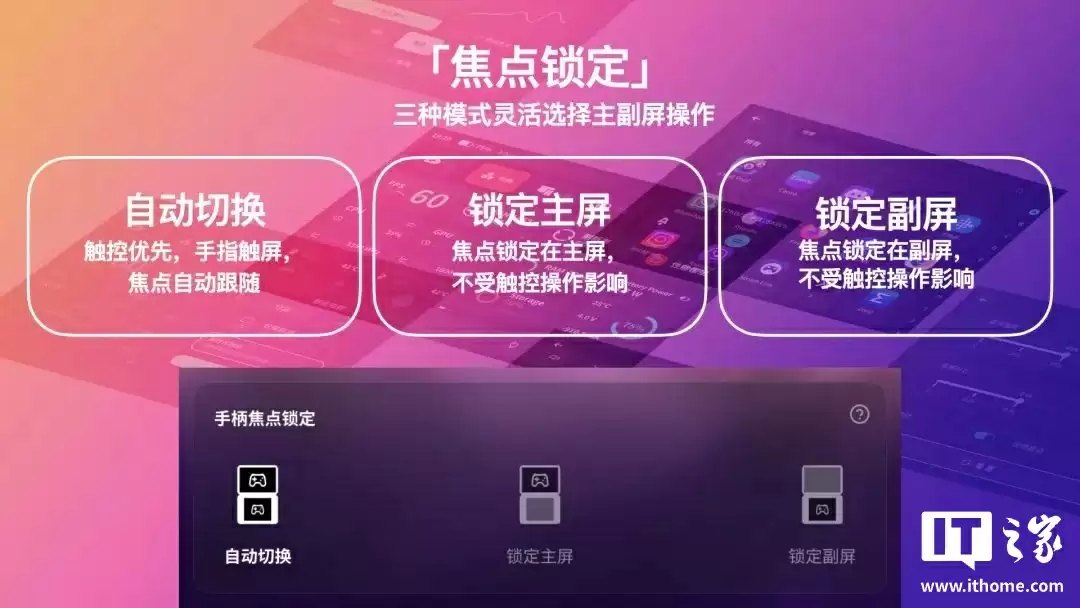 AYANEO Pocket DS 在双屏交互上迎来升级,全新「焦点锁定」功能可让主副屏的操作切换更加灵活与可控。支持玩家在“自动切换”、“锁定主屏”与“锁定副屏”三种模式间自由选择:自动模式下,触控优先,手指点击哪块屏幕,焦点便及时跟随;锁定模式可确保操作始终集中在指定屏幕,不受触控干扰。