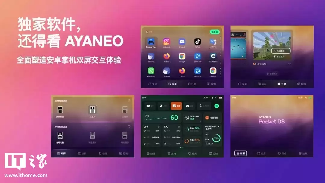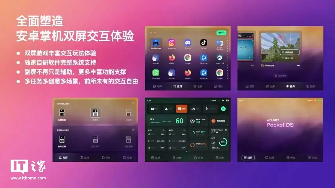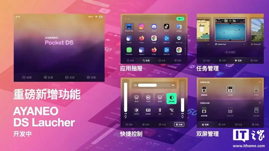 AYANEO 官方表示正在开发全新的 AYANEO DS Launcher 应用。全新的应用抽屉支持一键显示全部应用,提供按字母或自定义规则排序的高效检索方式;副屏配备卡片式多任务管理,主副屏任务可独立查看与控制,并支持单任务的扩展操作。