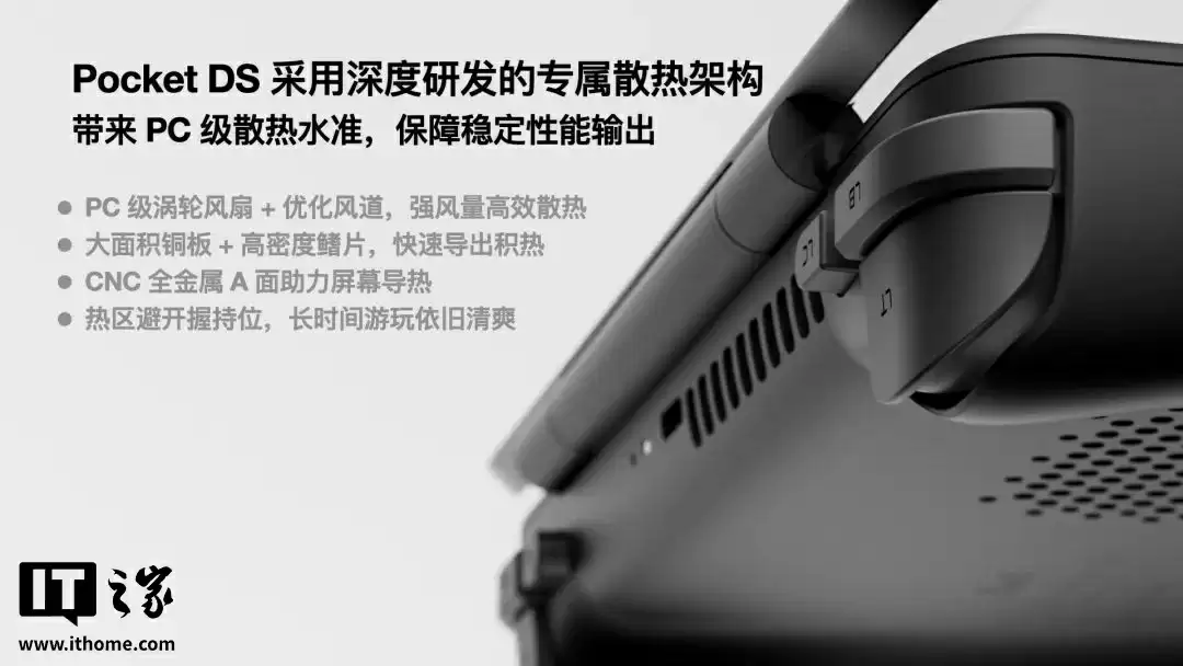 AYANEO 针对双屏掌机特性定制了 PC 级涡轮风扇与大面积铜板散热系统,结合 CNC 全金属 A 面的导热优势,将热量迅速带走,并避开握持区域,支持玩家长时间游戏。