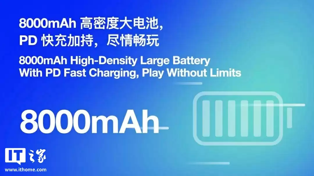 采用 8000mAh 容量电池、支持 PD 快充