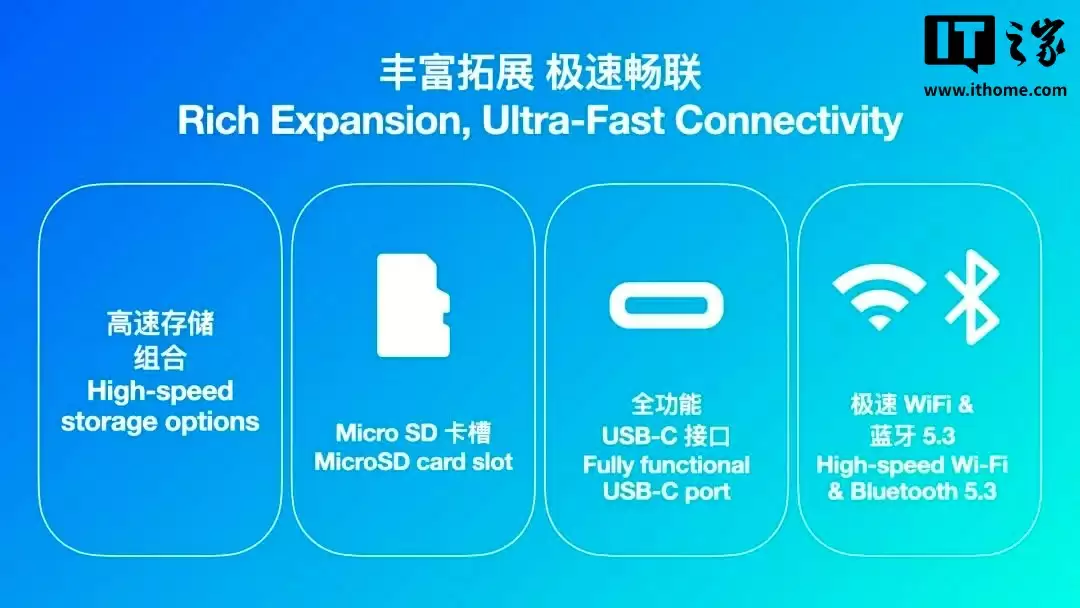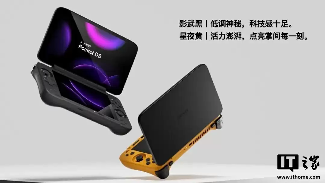 AYANEO Pocket DS 采用经典翻盖设计,配备 0-180° 无级转轴,采用 CNC 全金属 A 面,提供星夜黄与影武黑配色。掌机还配备 TMR 电磁中摇杆、霍尔线性扳机、全薄膜微动按键与大尺寸双 X 轴线性马达;所搭载的双扬声器采用正出音设计,搭配高速存储、Micro SD 卡槽、全功能 USB-C 接口、Wi-Fi、蓝牙 5.3。