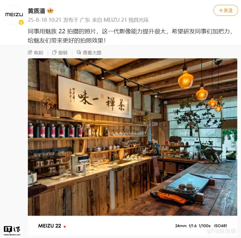 根据星纪魅族集团CEO黄质潘上午公布的实拍样张参数显示,这款新机的主摄像头拥有24mm焦距和f/1.6大光圈,长焦镜头则配备72mm焦距和f/2.4光圈。