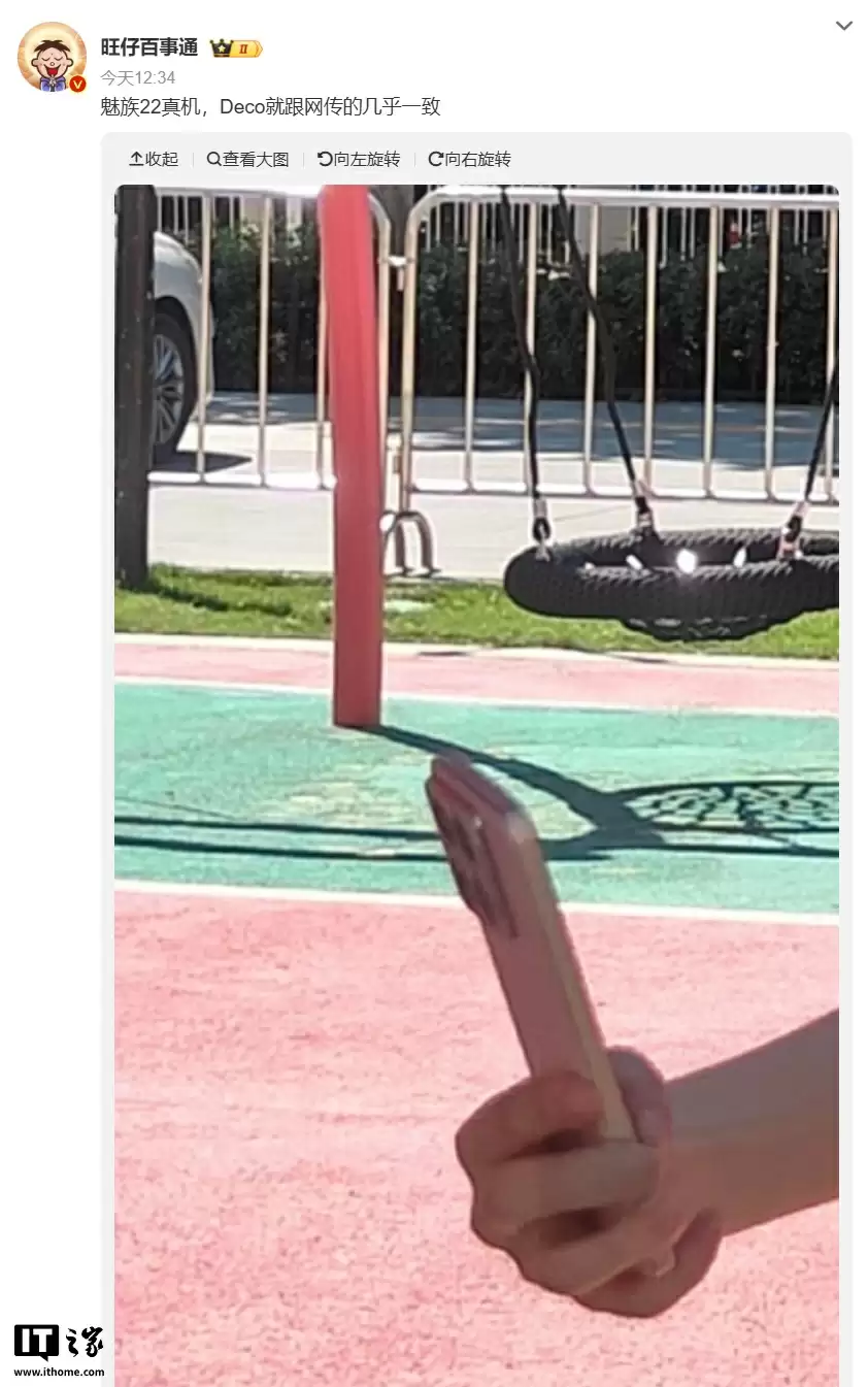 8月18日,知名博主@旺仔百事通在微博首次公开了魅族22手机的真机实拍图,并配文表示:「实际的摄像头模组设计与网络曝光图基本吻合」。