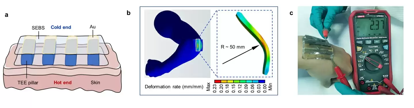 基于此成果,研究人员还开发出首台弹性热电发电机,能够直接与皮肤表面适配,保持较高的填充因子和较低的热阻,兼具高效的热电转换效率和优异舒适性、形状适应性,有望为可穿戴电子设备带来新应用。