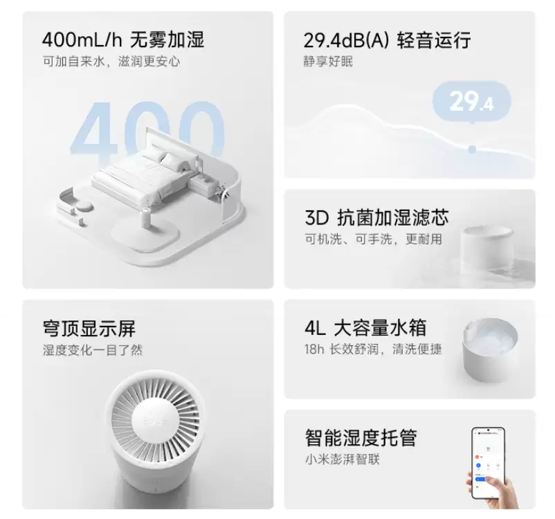 据产品介绍,这款新一代加湿器采用创新的穹顶式显示屏设计,在保持低噪音运行方面表现优异。其中600mL/h机型的运行噪音控制在30.7分贝,400mL/h版本更是低至29.4分贝。**两款机型均配备超大容量水箱**,分别为5升和4升。