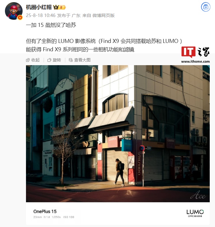 8 月 18 日消息,一张水印标注机型为“OnePlus 15”的照片已在互联网平台曝光,其中缺失了哈苏联名 LOGO。博主 @机圈小红帽 透露,一加 15 虽然没了哈苏,但有了全新的 LUMO 影像系统(Find X9 会共同搭载哈苏和 LUMO),能获得 Find X9 系列相同的一些相机功能和滤镜。