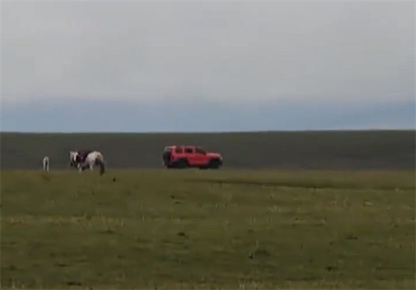 社交媒体上传的视频显示,当时草原上有马匹吃草,该车缓慢避开加速行驶,来回跑,跑了六七趟。