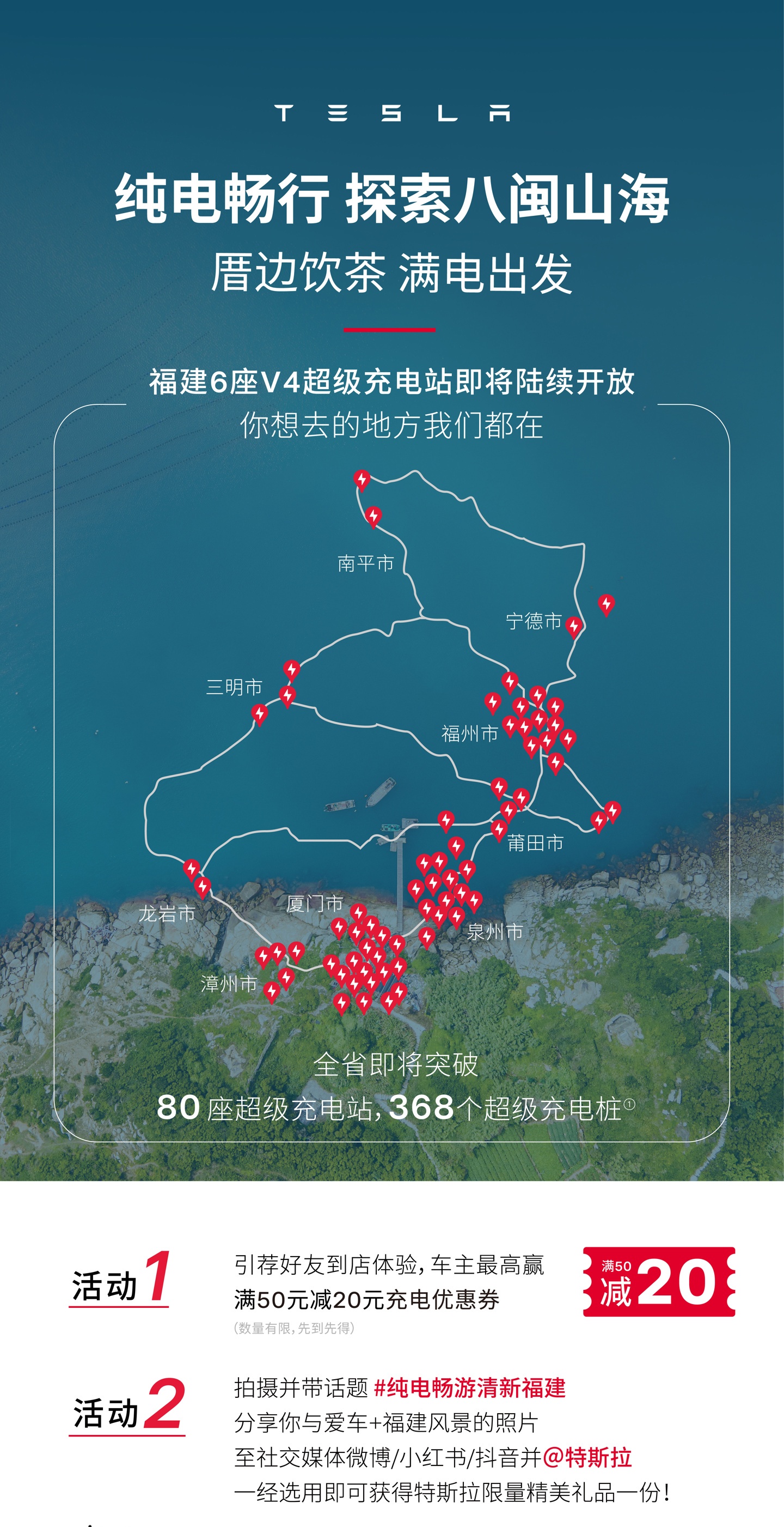活动二:拍摄并带话题#纯电畅游清新福建,分享爱车 + 福建风景照片至微博 / 小红书 / 抖音并 @特斯拉,一经选用即可获得特斯拉限量精美礼品一份。