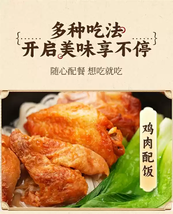 鸡肉配饭、聚餐下酒、鸡肉配菜卷、鸡肉拌面均可,吃法多样。