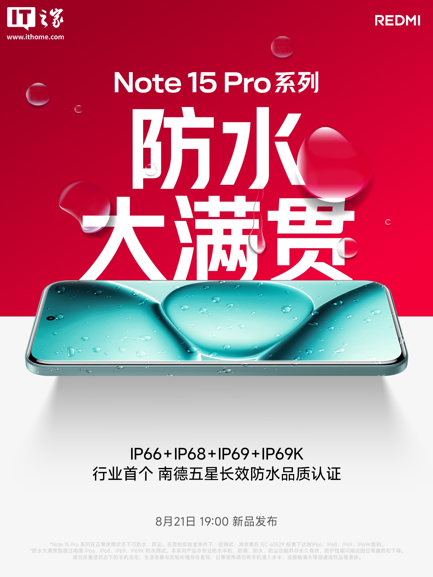 8月18日最新消息,Redmi Note 15 Pro系列手机将于8月21日正式亮相。这款新品主打"超强抗摔、旗舰防水、持久续航"三大核心卖点,致力于为用户带来更耐用的品质体验。