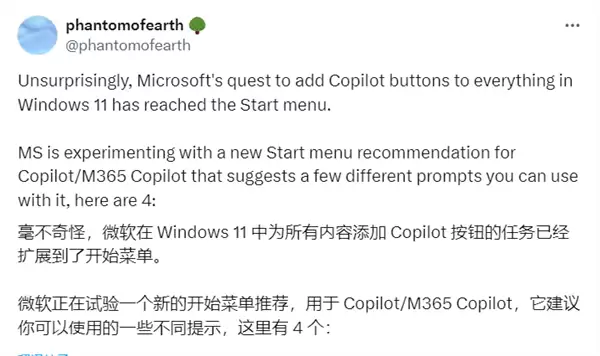 Phantomofearth最新发现,开始菜单也终于被Copilot所“入侵”,在开始菜单中会提示用户使用Copilot。