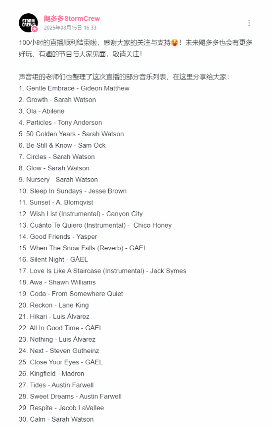 官方账号“飓多多StormCrew”也发文:“100小时的直播顺利结束啦,感谢大家的关注与支持!未来飓多多也会有更多好玩、有趣的节目与大家见面,敬请关注!”