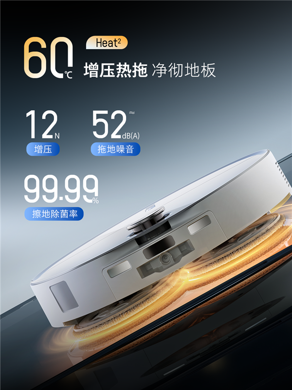 -60°C增压热拖搭配12N仿生加压,实现99.99%地面除菌率与100%擦地去污率,快速溶解顽固污渍;