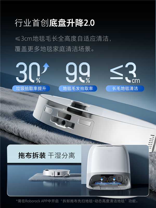 在复杂场景适配性上,新品带来行业首创的底盘升降2.0技术,底盘抬升可达2cm,支持自适应动态高度调节,4cm门槛可助跑跨越,3cm超长毛地毯也能安心清扫,垃圾拾取率提升30%。