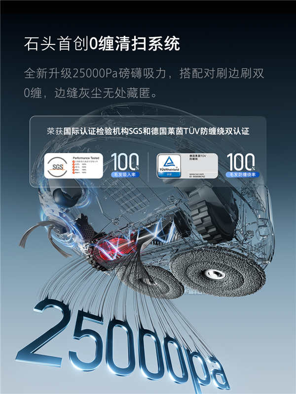 同时,25000Pa大吸力与0缠清扫系统组合,胶毛一体主刷实现100%毛发吸入率,边刷与万向轮设计也彻底杜绝毛发缠绕,解决宠物家庭清洁难题。
