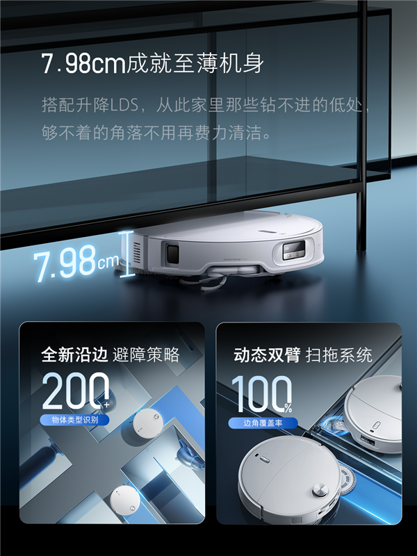 7.98cm行业至薄机身搭配升降双视角LDS,开阔区域360度精准建图,低矮空间自动降下机身并开启后部大视窗监测,沙发底、床底等死角清洁成功率达100%。