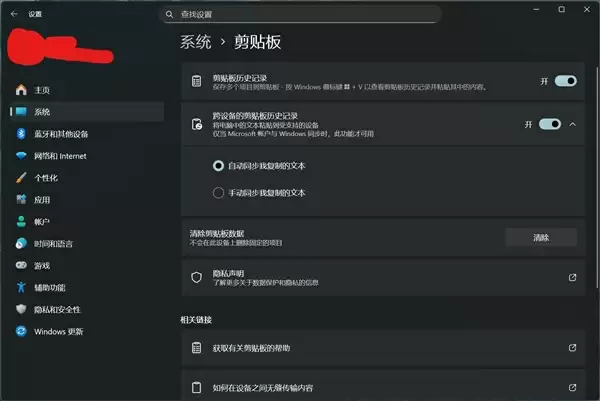 不过,跨设备同步的功能默认是关闭的,我们可以打开设置,依次点击系统——剪贴板,将跨设备的剪贴板历史记录打开。这里可以选择自动同步或者手动同步,默认是自动同步。