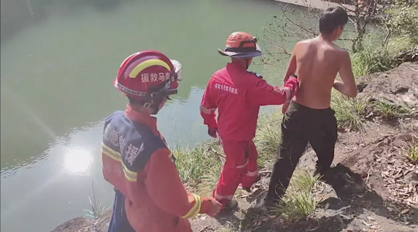 消防员将女子固定在担架上后,轮流抬运将其护送下山。另外3名中毒者则在救援人员的搀扶下同步撤离。