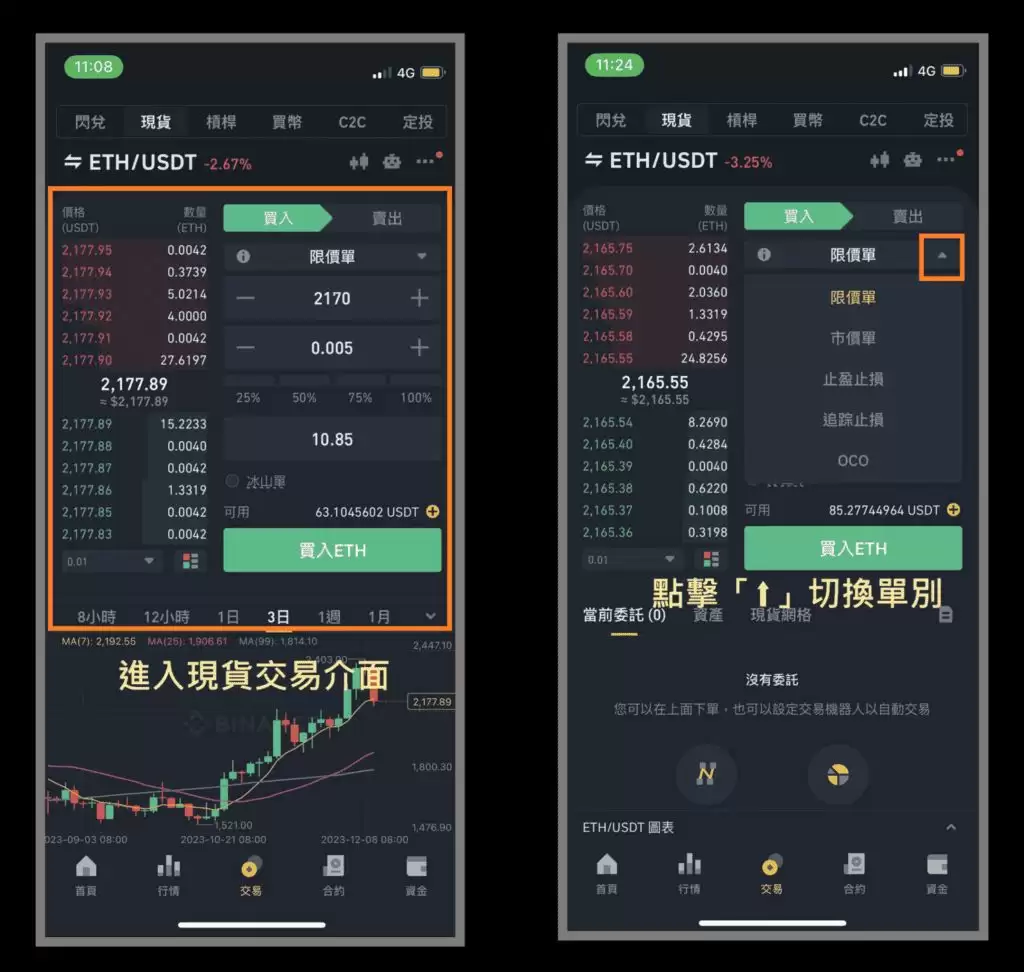 成功选择ETH和USDT后,将进入专业的ETH现货交易界面,系统提供了限价单、市价单、止盈止损、追踪止损、OCO等多种交易方式。