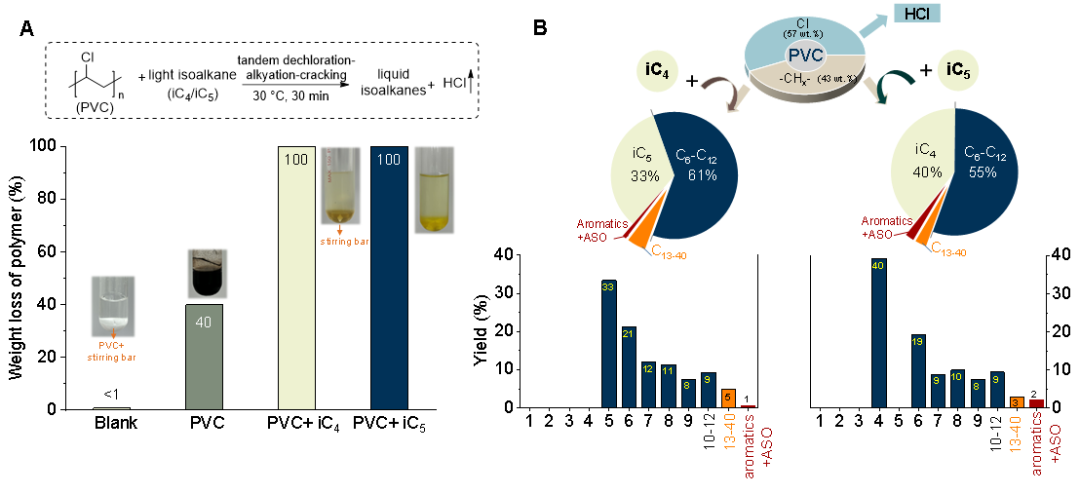 目前,含 PVC 的混合废塑料化学回收,仍面临重大技术挑战。传统的“脱氯 — 裂解”两步法通常先用脱氯剂去除氯元素,再通过高温裂解生成燃料或化学品。但该工艺存在能耗高、成本大、脱氯不彻底导致催化剂中毒,以及油品收率低、残余氯超标等问题,这些瓶颈严重限制了 PVC 废塑料在“双碳”目标下的高效资源化利用。