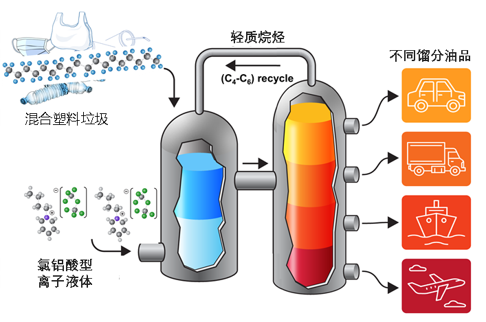 在技术设计上,团队高度关注工业化可行性,选择了一种名为离子液体的催化剂。该催化剂不仅价格低廉、活性高、腐蚀性低,而且操作安全可靠,已在美国雪佛龙与中石油的工业烷基化装置中得到验证。该技术利用离子液体可将混合废塑料几乎完全转化为无氯的高品质燃料。与传统高温裂解相比,新技术常温即可运行,安全环保,无有毒副产物,能有效阻断氯污染,转化为回收的氯化氢,溶于水即可生成无毒盐酸(人体胃酸的主要成分),从而兼顾资源利用与环境安全。