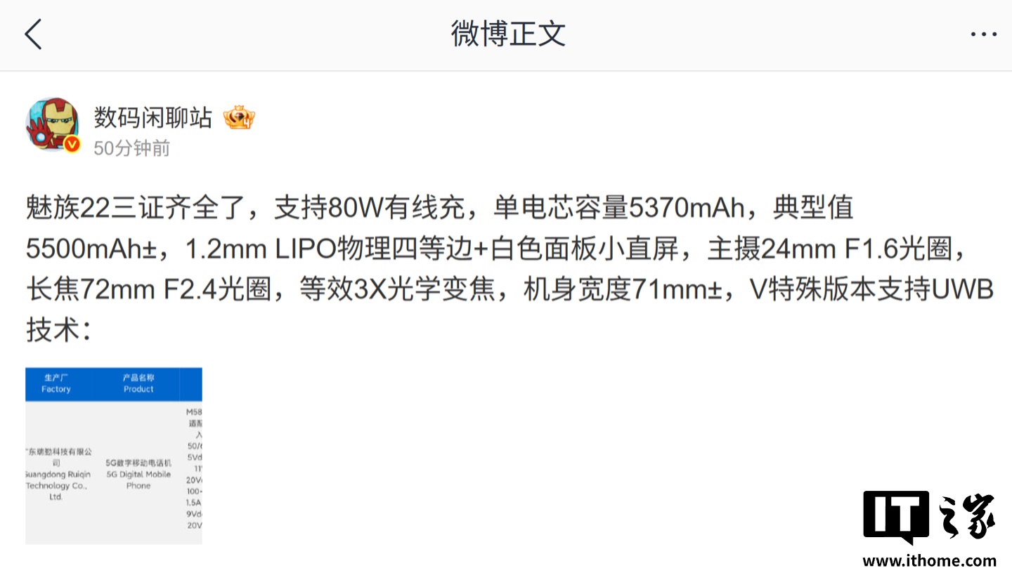 魅族22获三证认证:80W快充+1.2mm极窄直屏,UWB特别版亮相