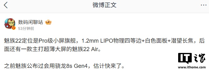 8 月 19 日消息,博主 @数码闲聊站 今天在微博透露,魅族 22 手机现已三证齐全,支持 80W 有线充。