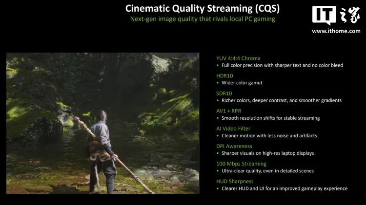 此外,如果用户有足够的带宽,GFN 现在允许以 5K 分辨率(适用于 16:9 显示器和超宽显示器)以 120fps 的帧率进行串流,或者在 1080p 下以高达 360fps 的帧率进行串流。此外,英伟达还推出了一种新的可选“电影级画质串流模式”,声称可以减少画面色彩溢出,并在串流过程中恢复场景中黑暗和模糊区域的细节。用户现在可以以高达 100Mbps 的速度进行串流,高于之前的 75Mbps,以维持这种画质(其使用 HDR10 和 SDR10,采用 YUV 4:4:4 色彩采样,通过 AV1 进行串流,并添加了 AI 视频滤镜以及一些优化,以使文本和 HUD 元素更加清晰)。