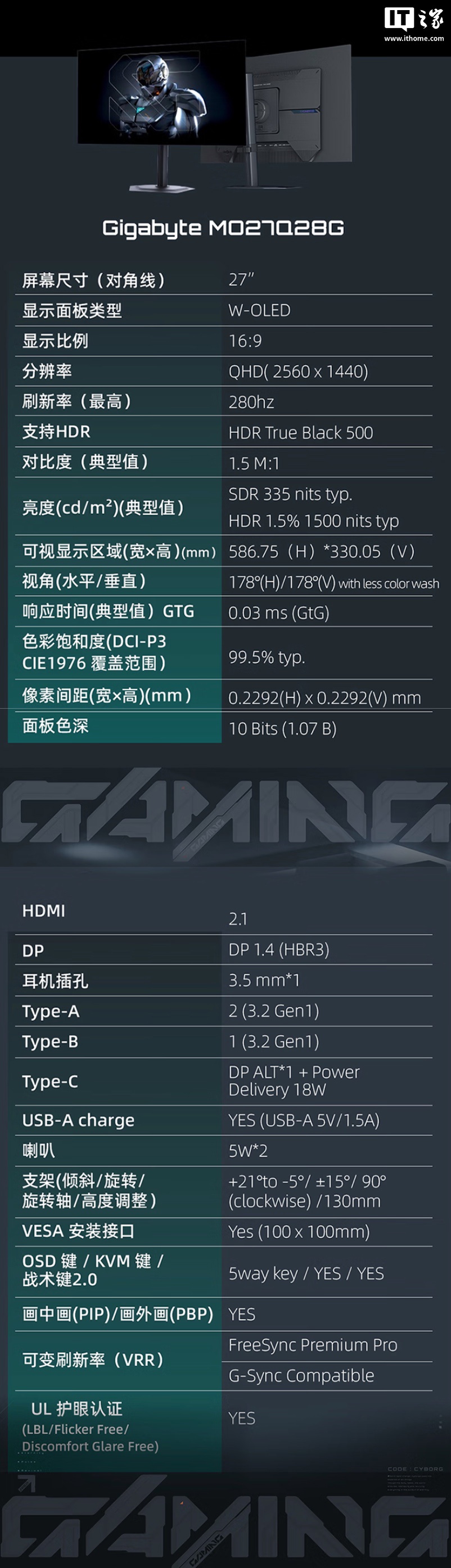 技嘉MO27Q28G显示器首销:27英寸2K 280Hz W-OLED屏+双扬,2899元入手