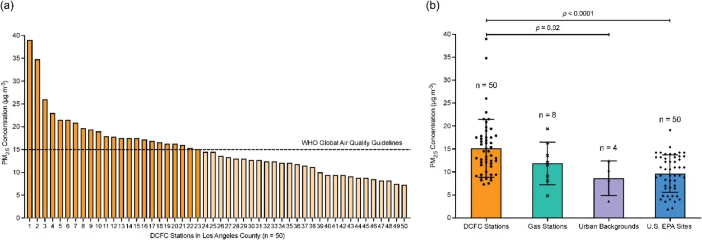 据了解,这项研究由加州大学洛杉矶分校菲尔丁公共卫生学院的研究人员开展。他们对 50 个直流快速充电站进行了检测,并与其他场所进行了对比。研究重点关注的是直径约为人类头发三十分之一的细颗粒物(PM2.5),这类颗粒物可能对人体健康构成威胁。