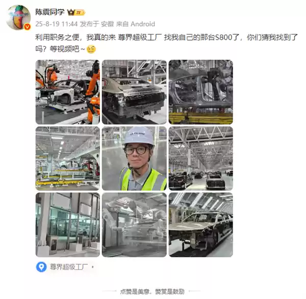 8月19日消息,今日中午,知名汽车博主陈震同学发布微博称,自己受邀参观了尊界超级工厂,同时他还戏言要找找自己下定的那台S800。