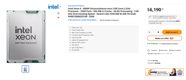现在,这款处理器在主要零售商处的价格再次大幅下降,在北美市场,Newegg可能是第一个将该处理器标价为6190美元的零售商。