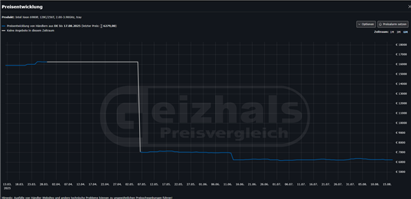 在德国价格也降至接近6000欧元,5月份时该CPU价格从超过16000欧元下降到仅7000欧元,6月份又明显下降,自那时以来,价格一直稳定在约6000欧元左右。