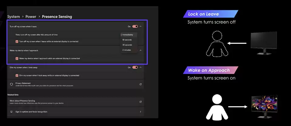 微星 OLED Care 3.0 在此前 2.0 版本的基础上新增了基于 NPU 的 AI 人在监测系统:其配备了始终开启的 CMOS 传感器,每 0.2s 进行一次拍摄,通过 NPU 在本地确认是否存在人体,如用户离开屏幕可自动关机或进入屏幕保护模式,最大程度减少烧屏风险并可显著降低能耗。这一系统也可在用户视线偏离时自动降低屏幕亮度。