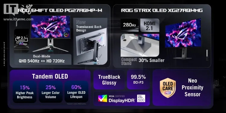 据了解,ROG Swift OLED PG27AQWP-W 配备了一块 26.5 英寸的 2560 x 1440 QHD OLED 屏幕,支持高达 540Hz 的刷新率。更令人惊叹的是,这款显示器还具备双模式功能,当用户将分辨率调整至 720p 时,其刷新率可飙升至 720Hz。