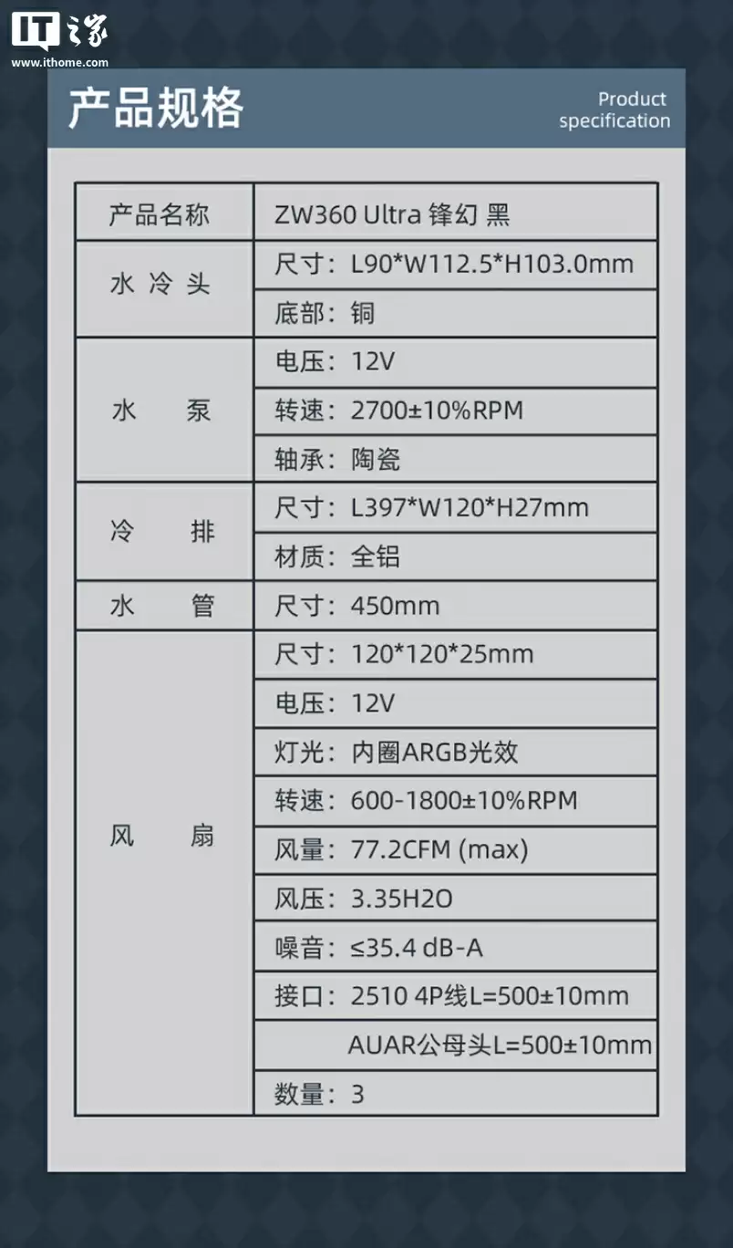 散热性能方面,这款水冷采用了1.5mm厚度纯铜底座,搭载陶瓷轴承2700RPM高性能水泵。450mm长度的橡胶水管搭配12水道27mm标准厚度铝制冷排,确保出色的散热效果。