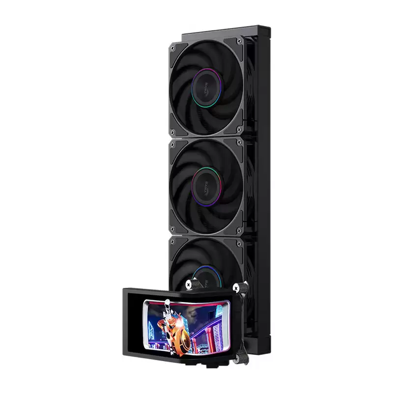 这款水冷散热器的最大亮点在于其独特的曲面OLED显示屏设计,能够实现360度自由旋转调节。相比传统固定式曲面屏水冷,或是联力此前展示的HYDROSHIFT II LCD CURVED原型产品,它为用户提供了更灵活的显示角度调节能力。