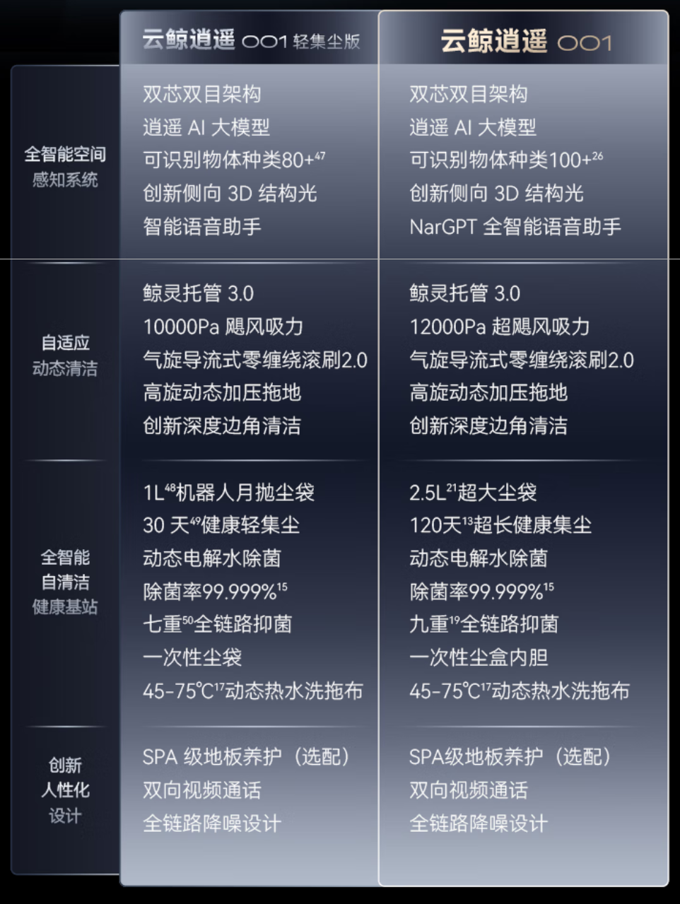 附逍遥 001 标准版与轻集尘版配置对比如下: