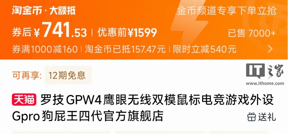 天猫罗技 GPW 4 鹰眼三色可选券后 899 元领 160 元券淘金币抵扣后低至 741.53 元: