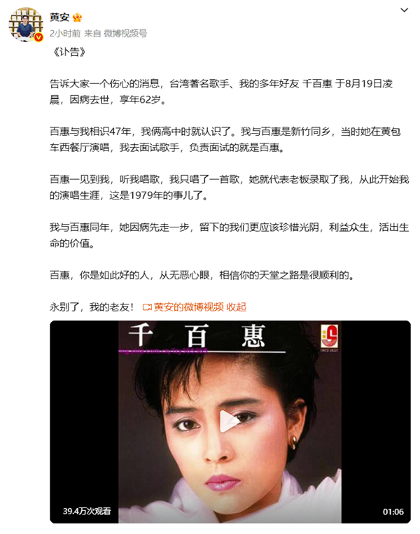 8月20日消息,今晚,认证为“台湾歌手,主持人,作家”的黄安发布讣告,称著名歌手、自己的多年好友千百惠于8月19日凌晨,因病去世,享年62岁。