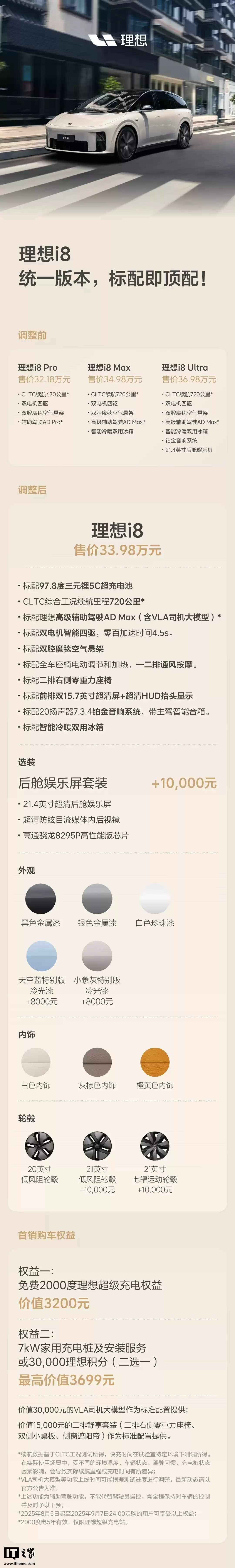 值得一提的是,理想汽车于8月5日对i8车型配置进行了统一调整,全系升级为理想i8 Max标准配置,官方售价由34.98万元调整为33.98万元。此外还特别赠送价值1万元的铂金音响系统,后舱娱乐屏套装则作为选配项目提供。该车型于7月29日正式亮相,初期推出Pro、Max、Ultra三款配置,起售价32.18万元。据理想汽车CEO李想此前在视频中透露,理想i8纯电SUV的预售订单已突破3万辆。