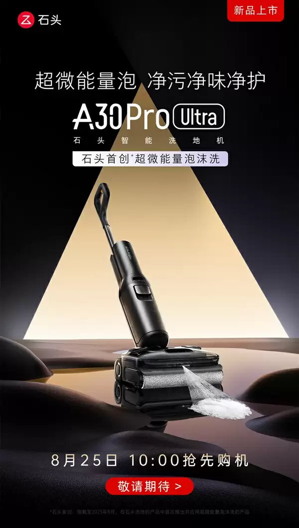 在此背景下,石头科技出手了!8月25日,石头科技将推出一款具有划时代意义的新品 —— 石头A30 Pro Ultra,这款产品行业首创的超微能量泡沫洗地技术,号称“泡沫洗地机皇”。