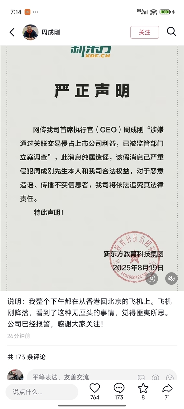 新东方还强调,该假消息已严重侵犯周成刚先生本人和新东方合法权益对于恶意造谣、传播不实信息者,新东方保留依法追究其法律责任的权利。
