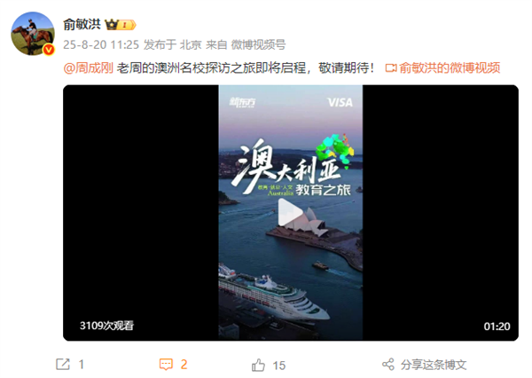 俞敏洪表示:老周的澳洲名校探访之旅即将启程,敬请期待!