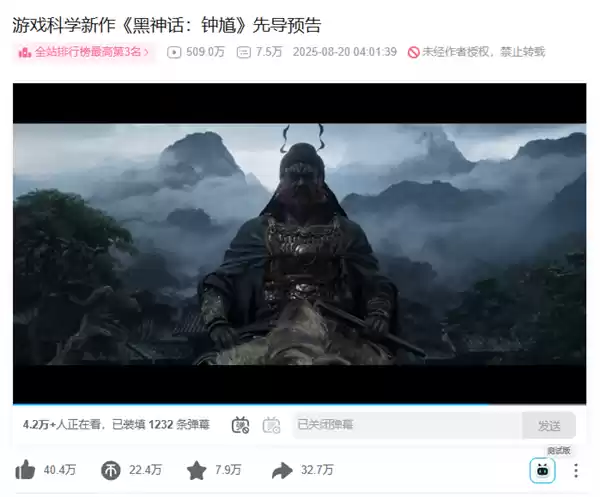 在B站平台,《黑神话:钟馗》的先导预告片发布仅6小时,播放量便突破500万,强势跃居全站热门视频排行榜第3名。