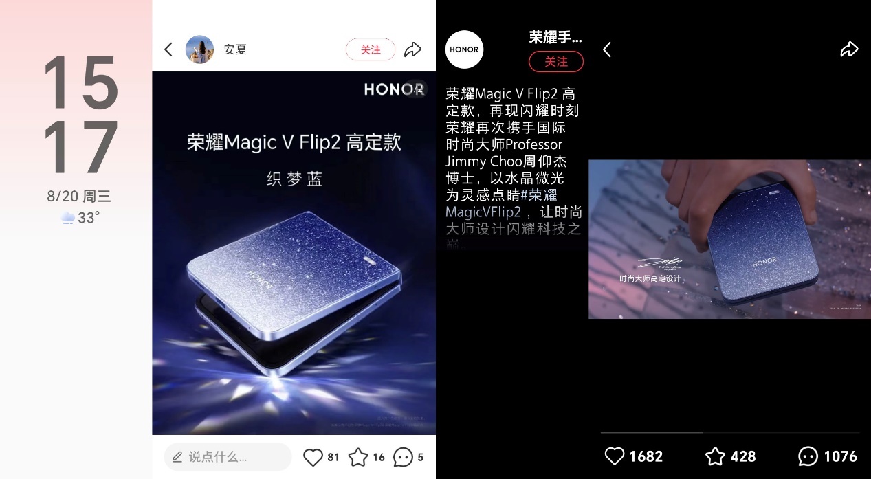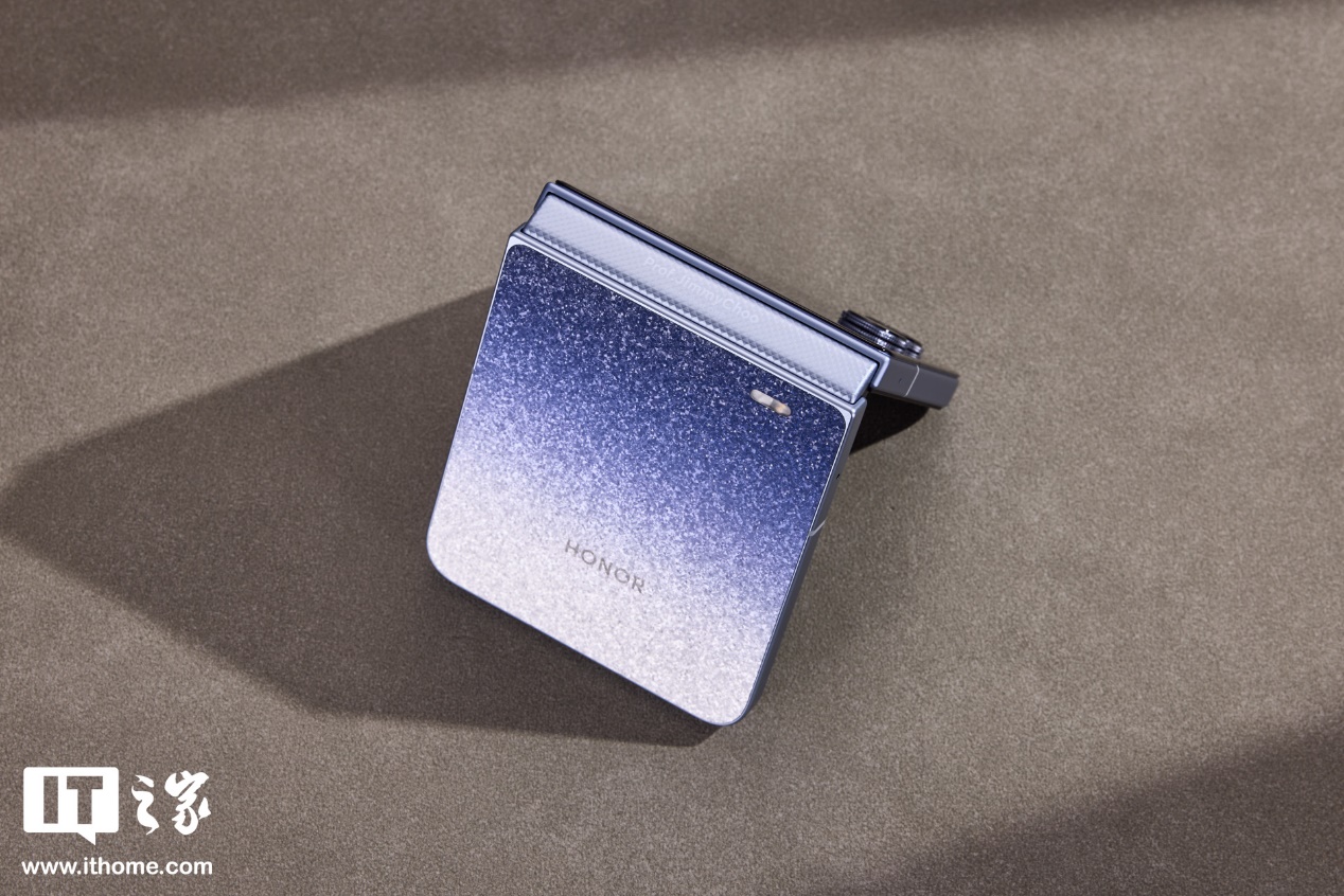 拿到的这款荣耀 Magic V Flip2 高定款继续由国际时尚大师、Professor Jimmy Choo 周仰杰博士亲自操刀设计,采用蓝紫和银色渐变而成的织梦蓝配色,配合细腻的喷砂工艺处理,直接将 Jimmy Choo 水晶鞋上闪耀夺目的华丽效果做到了手机上,如果平时就喜欢闪粉效果,那么这款织梦蓝配色的荣耀 Magic V Flip2 高定款一定很适合你。